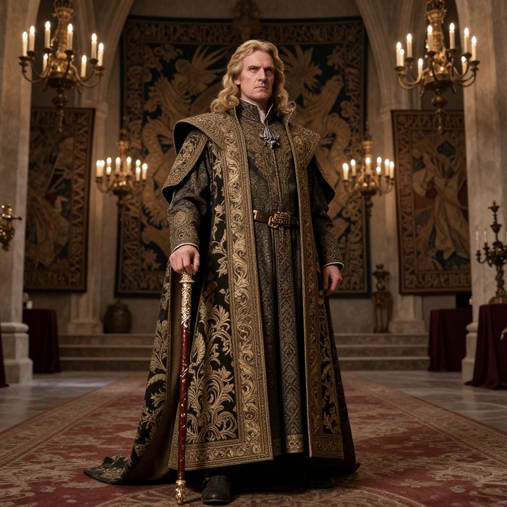 A photograph depicts a tall, blonde man with long, wavy hair standing confidently in an ornate, dimly-lit room. He wears an elaborate, black and gold, Renaissance-style robe with intricate patterns, and holds a gold-tipped cane in his right hand. The background features tall, stone arches, large, ornate tapestries, and multiple chandeliers with lit candles. The floor is covered with a rich, red-patterned carpet. The man's stern expression and regal attire suggest a historical or fantasy setting, evoking a sense of power and nobility.