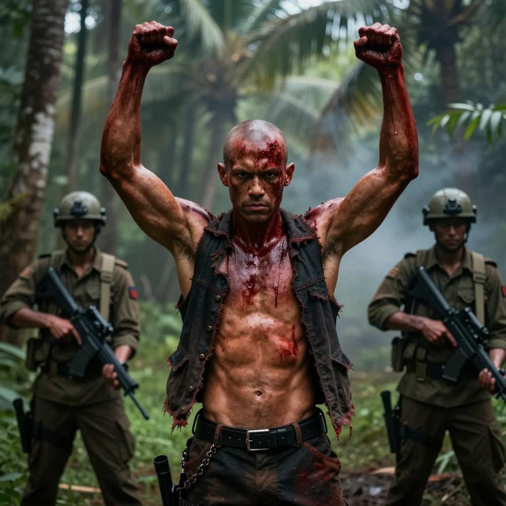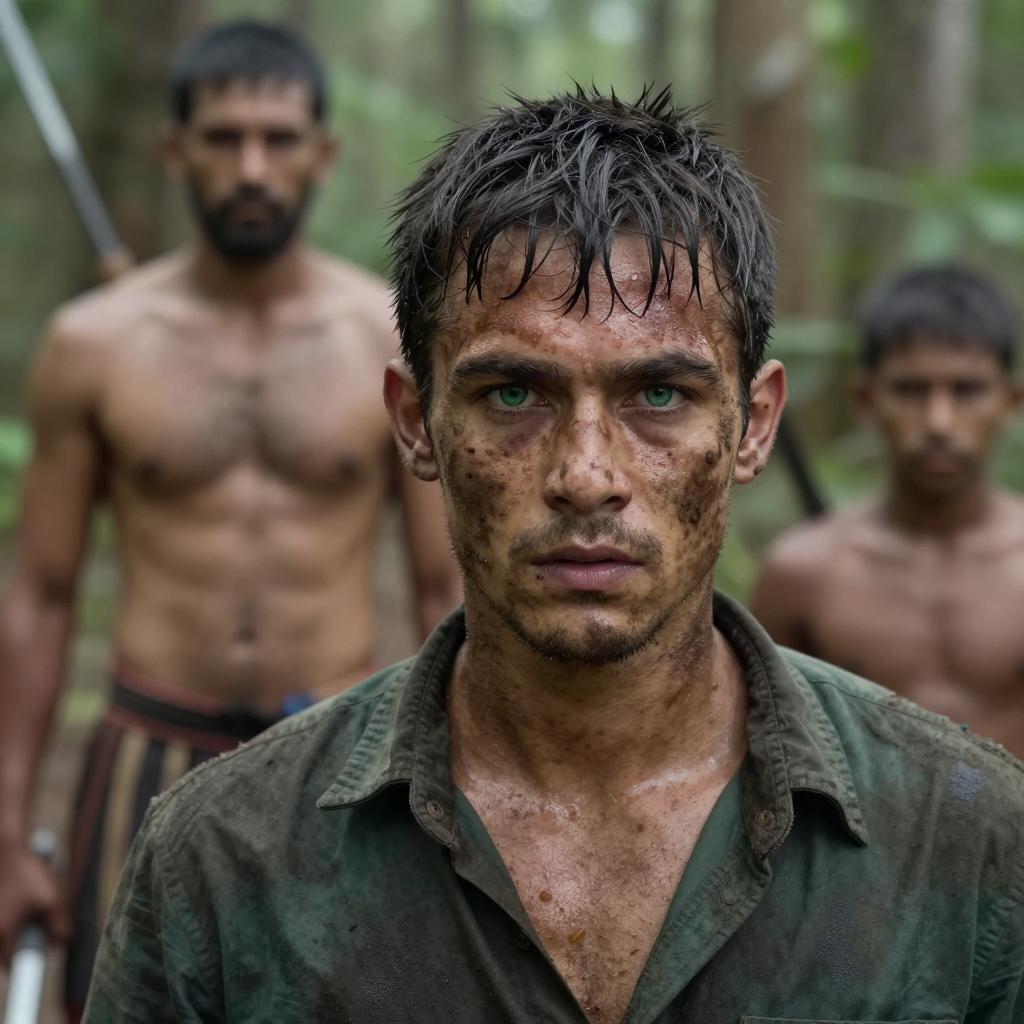 Group of wet, muscular men in dark, soaked clothing standing in rain. Center man with serious expression, wet hair, open shirt. Background men with stern faces, some shirtless. Green, blurry forest background. Raindrops visible. Dark, moody lighting. Five men total.