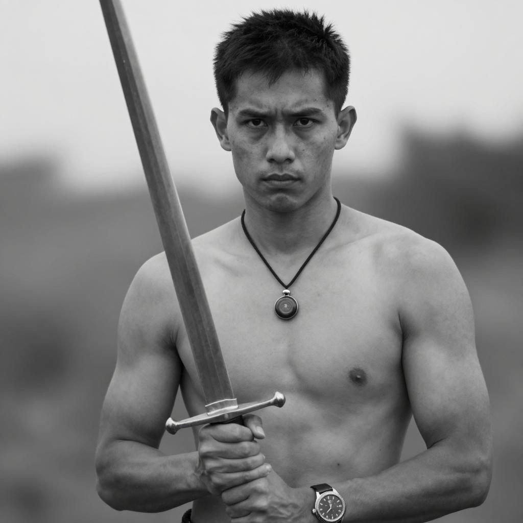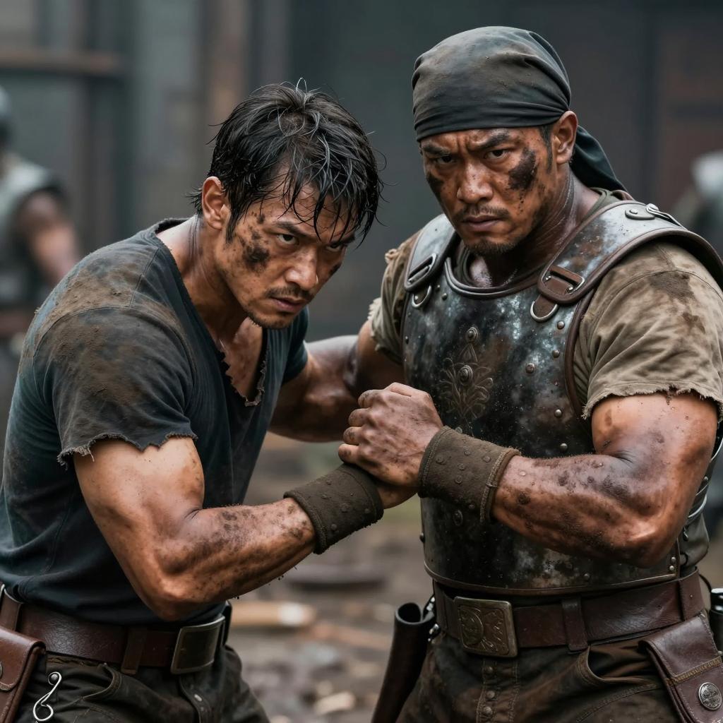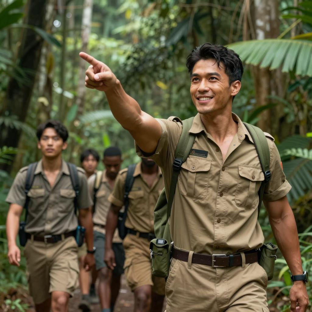 Group of five wet, muscular Asian men standing in the rain with serious expressions. The central man wears a soaked black open shirt with rolled-up sleeves, while the men in the background are shirtless or in dark wet clothing. The setting is a rainy outdoor forest environment with green, blurred foliage in the background. The mood is intense and moody, emphasizing determination and strength.