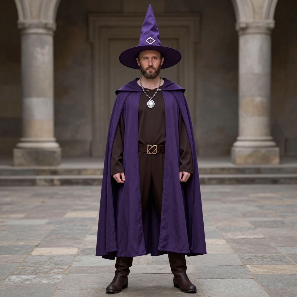 Adult warlock costume, wizard, 1boy, male focus, solo, hat, brown pants, wizard hat, boots, full body, standing, pants, looking at viewer, necklace, facial hair, closed mouth, witch hat, jewelry, beard, purple cape, long sleeves, old, purple headwear, cape, brown footwear