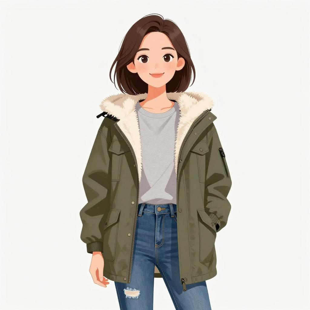 Woman with pretty face and pretty hair. smiling Woman, casual, olive green parka with white faux fur lining, front flap pockets, zipper and snap button closure, light grey crewneck t-shirt, distressed blue jeans with a slight fade and minor rips, partially tucked in at the front. --sref 1467