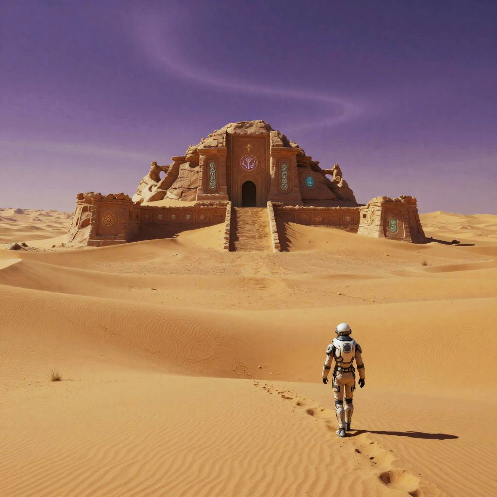 Damogran, a mystical alien desert planet with endless golden dunes under a swirling violet sky, ancient ruins half-buried in sand, mysterious glowing symbols etched into stones, a lone explorer in a futuristic suit navigating the harsh terrain, cinematic epic landscape.