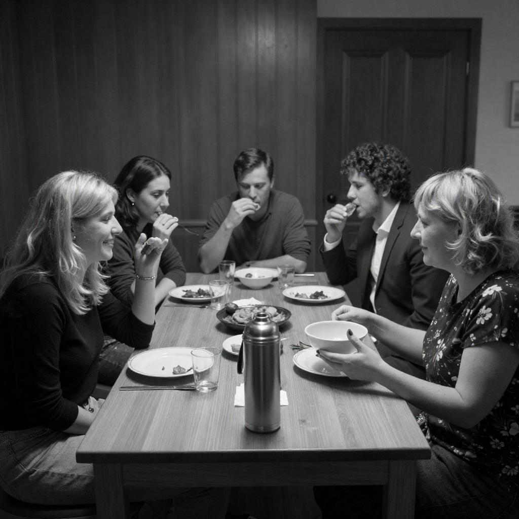 Photograph of a large family gathered around a festive table. Long-haired man in beige shirt and red tie on the left, smiling. Curly-haired woman in pink top next to him, smiling. Elderly man with glasses in background, smiling. Blonde woman in black top, smiling. Man in purple sweater on the right, smiling. Table filled with various dishes, baskets, and plants. Potted plants in background. Children seated at table, some visible. Warm, casual setting.