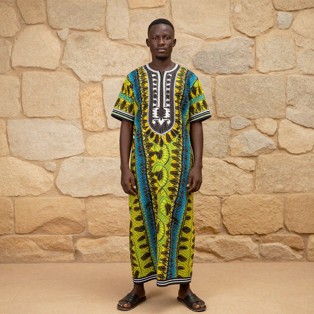 "West Africa Costume, man in a traditional african dress standing in front of a stone wall"