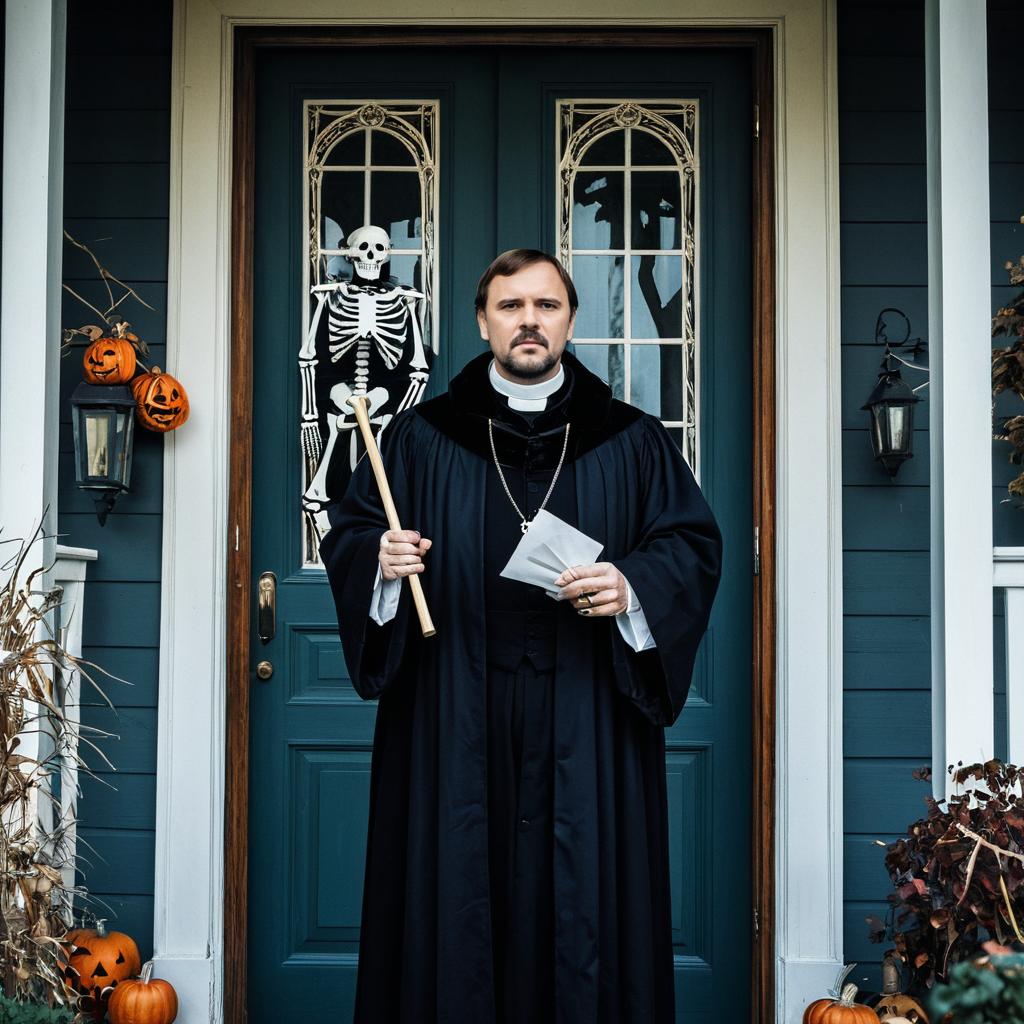 A man dressed as Martin Luther stands in front of a blue door decorated for Halloween. He holds a wooden mallet and some papers, wearing a traditional black clerical robe with a white collar and a pendant necklace. The door behind him features a paper skeleton decoration, and the porch is adorned with carved pumpkin jack-o'-lanterns and autumn foliage, creating a festive suburban Halloween scene.