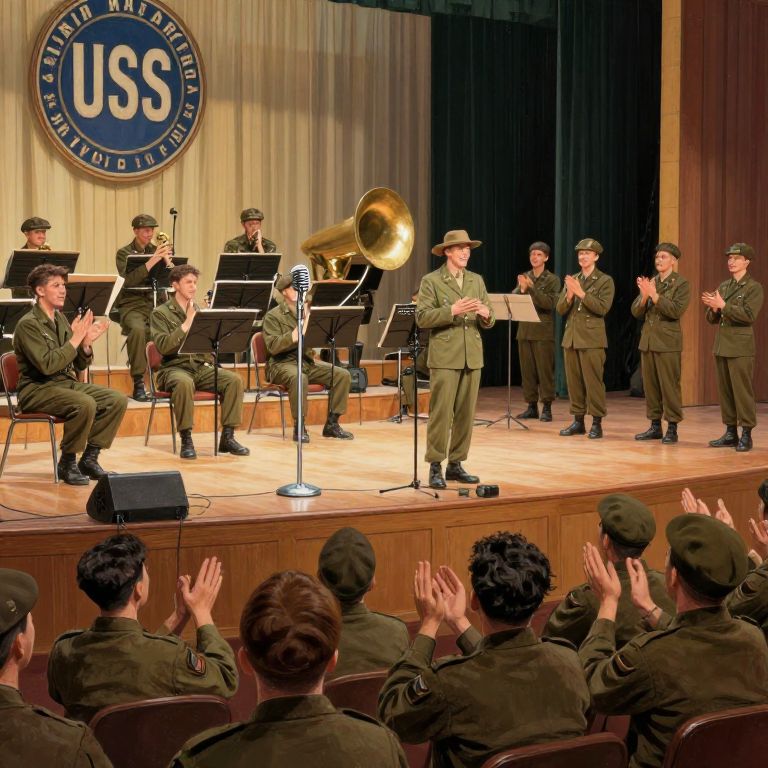 Detailed artistic rendering of a USO show stage with vintage microphone, a big band orchestra playing, and diverse soldiers clapping and cheering, highlighting the spirit of morale and entertainment during World War II.