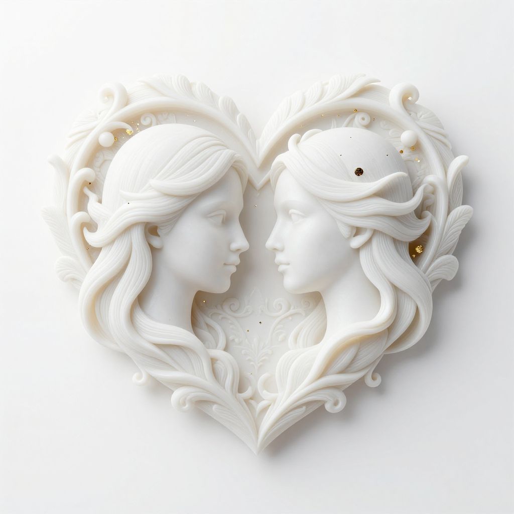 The image presents a surreal, fantasy scene set against a white background. At the center, two faces, seemingly of a woman, are intricately carved into a heart-shaped form. The faces are white, with delicate features and flowing hair, creating a sense of ethereal beauty. Surrounding the faces, the heart is adorned with ornate, leaf-like patterns and delicate, swirling designs, adding to the fantastical atmosphere. The heart appears to be made of a soft, translucent material, with subtle shadows and highlights that give it a three-dimensional quality. Small, golden flecks are scattered throughout the heart, enhancing its ethereal and magical appearance. The overall composition is balanced, with the faces and heart centrally positioned, creating a harmonious and captivating visual experience.
