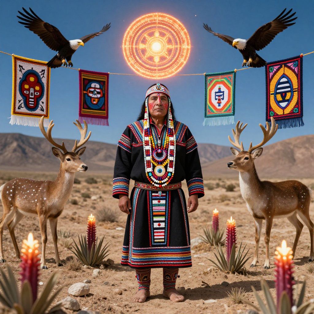 Huichol shaman in traditional attire, surrounded by sacred animals like deer and eagles, mystical desert environment with peyote plants, glowing yarn paintings floating around, intricate beadwork textures, magical realism style with vibrant colors