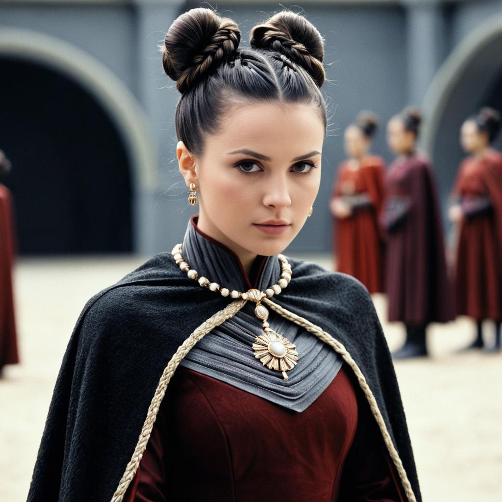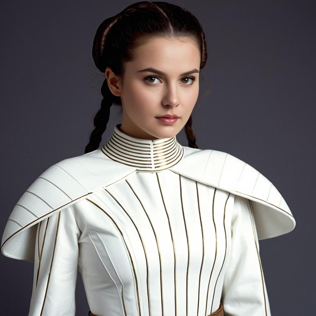 Rodwake girl padme amidala,1girl, solo, realistic, looking at viewer, hair bun, long sleeves, brown eyes, brown hair, braid, closed mouth, standing, arms at sides, simple background, dress