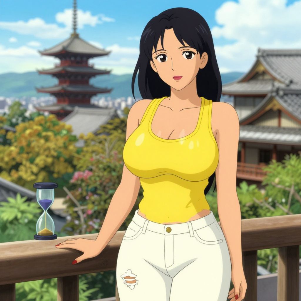 A hourglass woman in a sheer yellow tank top and distressed off-white jeans stands on a terrace overlooking a historic site, embodying the vibrant and colorful visual style of Kyoto Animation. Sexy. Pretty face and beutiful eyes Sexy. Pretty face and beаutiful eyes. Big breasts