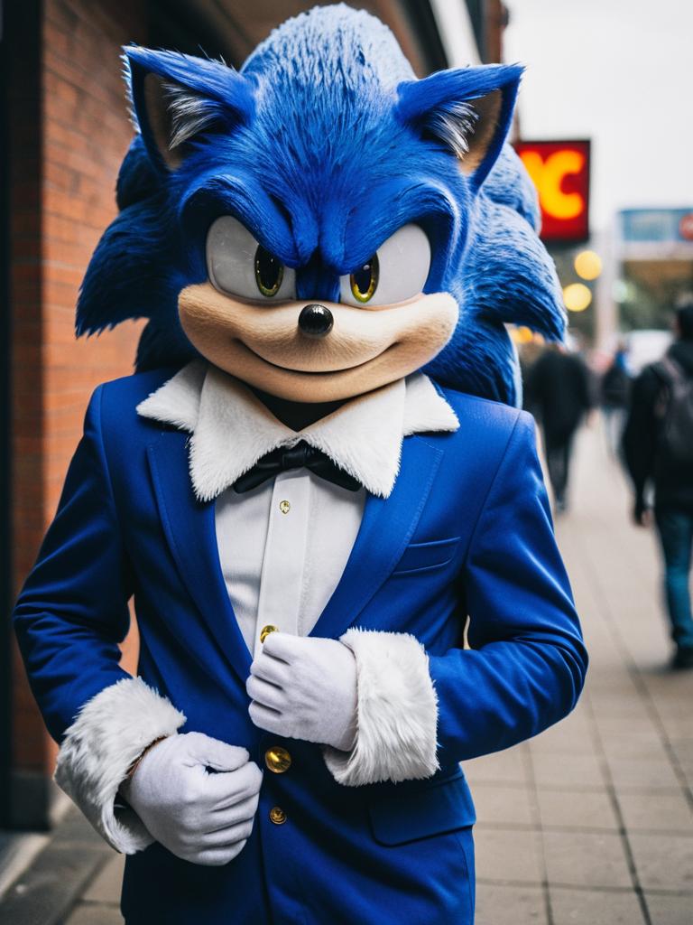 Man in Sonic the Hedgehog Costume, cinematic realism, editorial cosplay portrait