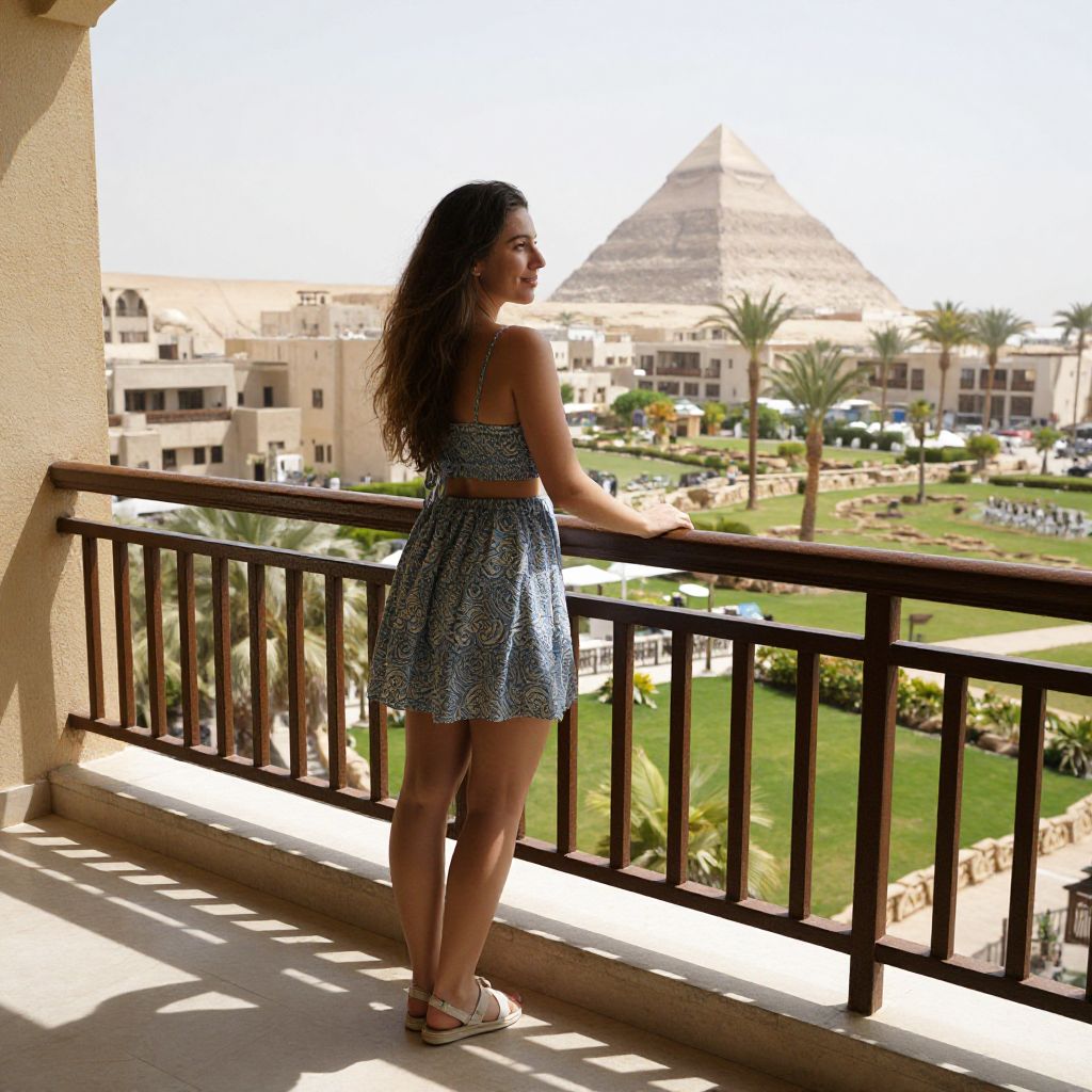 Fototapeta Young woman enjoying the view from hotel balcony in Egypt. Having good time in tropical resort