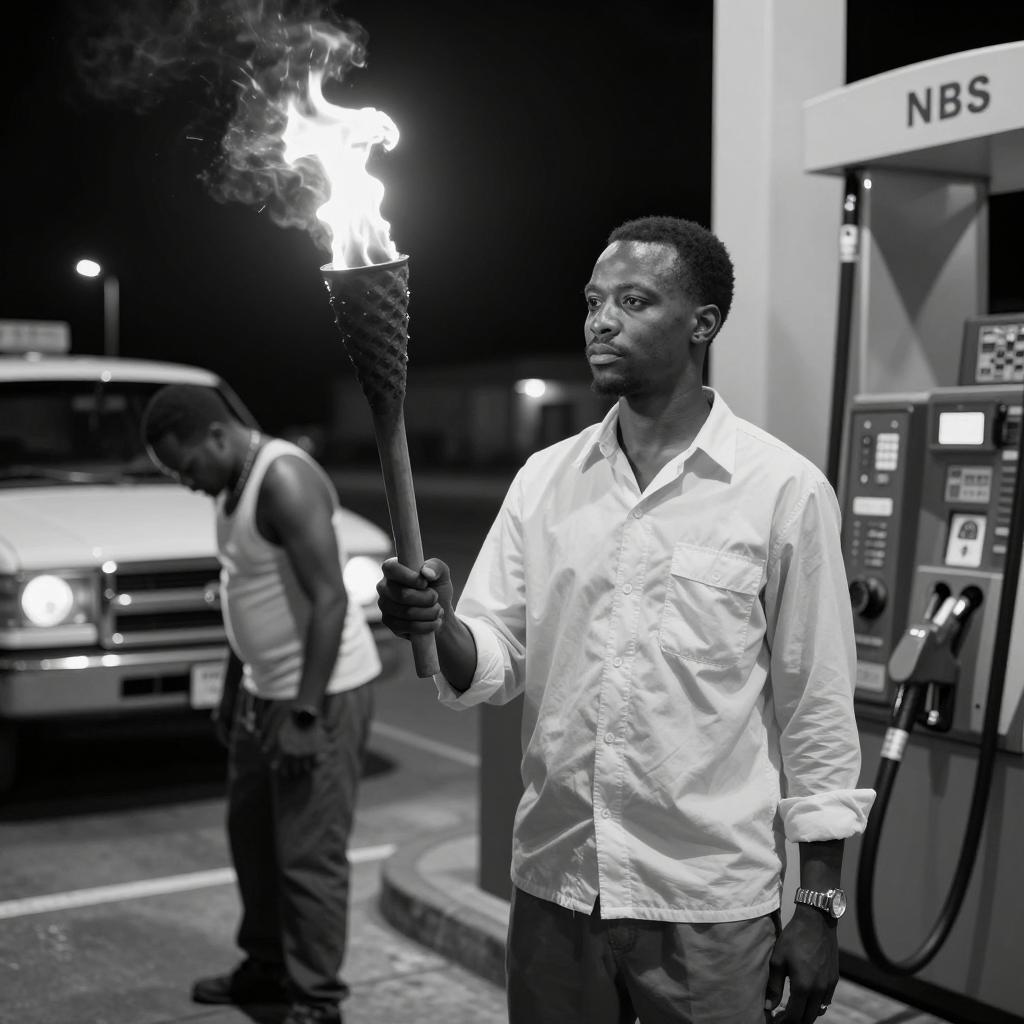 Black and white photograph. Primary subject: African American man with short hair, wearing a light shirt and pants, holding a flaming torch in his right hand. Background: another man, also African American, wearing a tank top and pants, bending over a gas pump. Both men are near a truck on the left. Nighttime setting. Flames from the torch are bright and centered. The man holding the torch has a focused expression. The gas pump has a hose extending to the right.