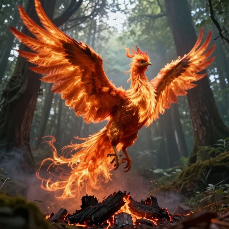 Craft an enchanting portrait from a low-angle viewpoint, blending elements of fantasy with an ethereal forest backdrop to capture both the awe-inspiring grandeur and delicate beauty of nature. In the foreground, a majestic phoenix rises from the ashes, its fiery wings spread against the sky in a display of wonder and mystery. The scene should evoke a sense of enchantment and intrigue as it invites viewers to delve into the captivating fusion of reality and imagination that lies beyond the veil of our everyday world, reminiscent of surrealistic art with dreamlike qualities.