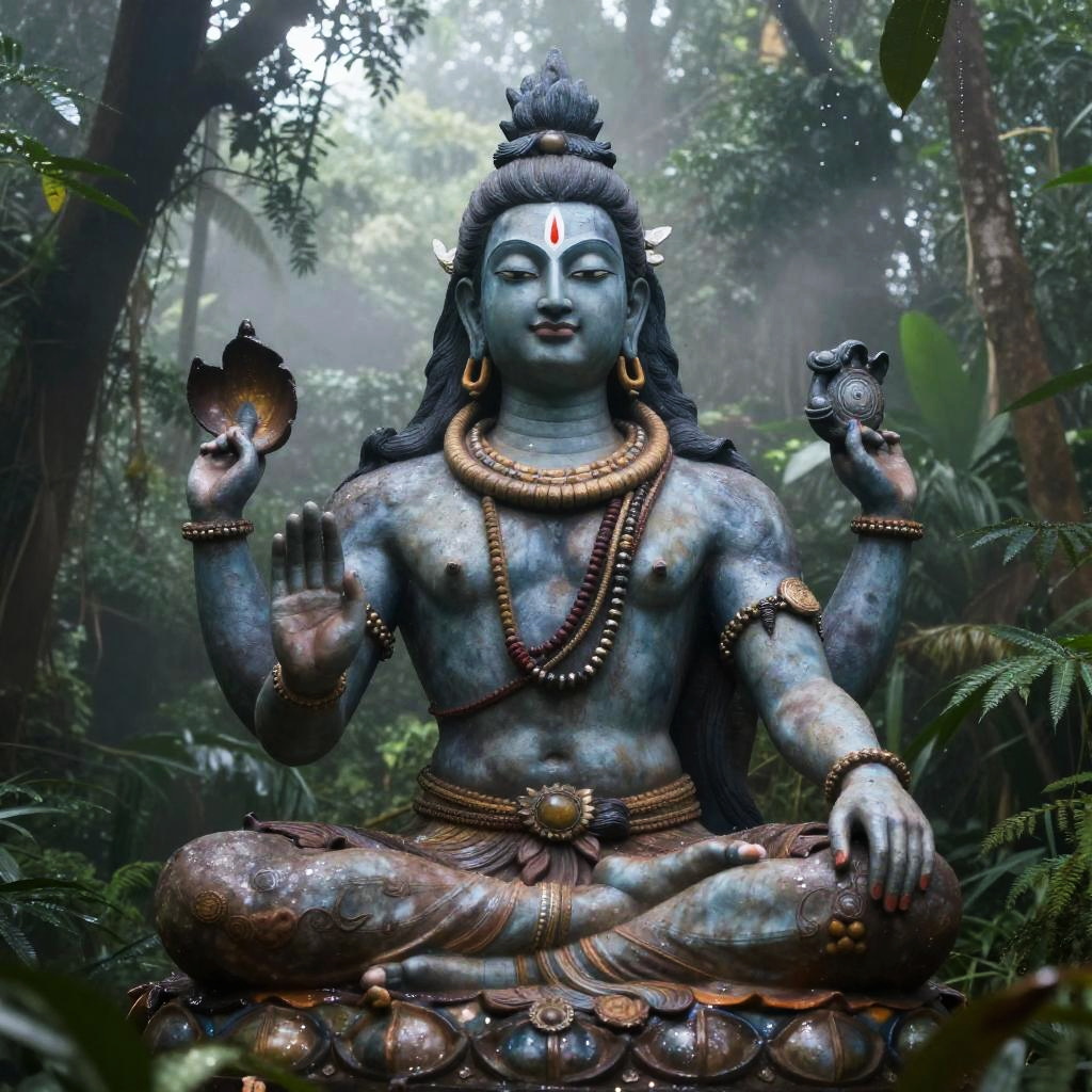 Realistic photo.An ancient statue of Shiva in the jungle, surrounded by mist. Captured with shimmering light dancing on the mist, styled in hyper-detail by Katsuya Terada. realistic photo