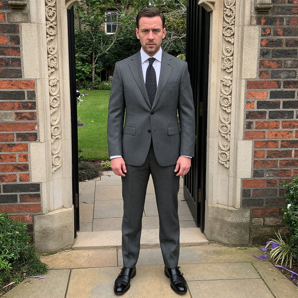 A man, graphite grey suit, soft white dress shirt, patterned black tie, elegant black monk strap shoes, fitted trousers, historic brick exterior, intricate stone carvings, lush garden entrance, candid shot, confident expression Man has masculine face and piercing eyes