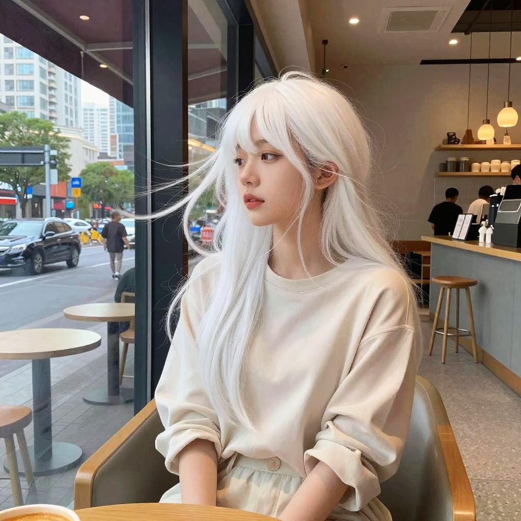 Girl with white hair seated in a modern urban cafe, soft pastel color palette, contemporary fashion, light breeze playing with strands of hair, reflective glass windows with cityscape view, realistic digital painting, warm and cozy atmosphere