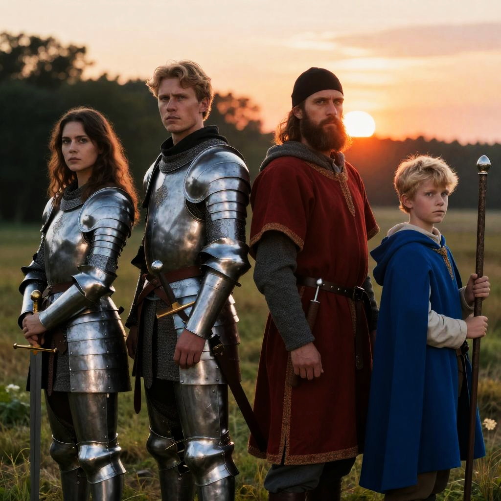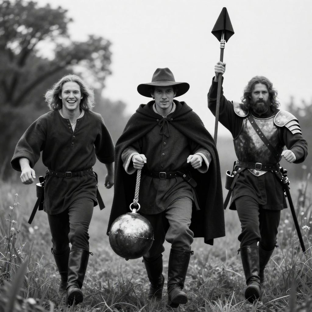 Black-and-white photograph of three men running through tall grass. The man on the left has long hair, wears a dark tunic, and smiles widely. The central figure wears a wide-brimmed hat, dark cloak, and holds a rope with a large metal weight. The rightmost man has a beard, wears armor, and raises a staff with a dark cap. All three have intense expressions. Trees are in the background.