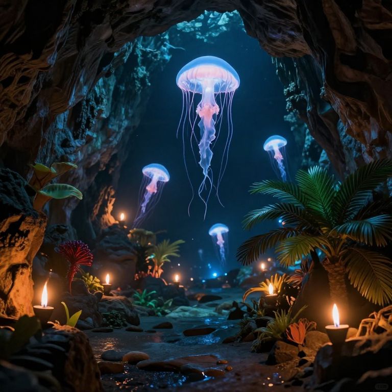 Photograph of a glowing underwater cave with bioluminescent jellyfish, lit by candles, surrounded by colorful plants and rocks.
