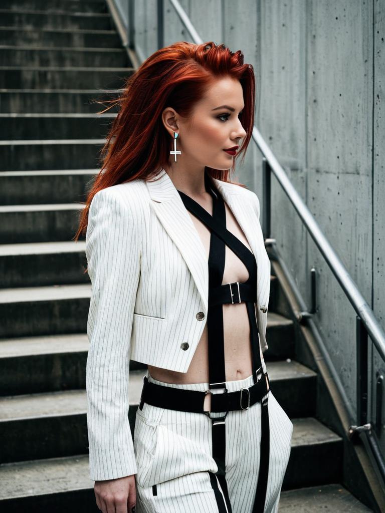 A hyper-detailed portrait of a red-haired woman exuding confidence, dressed in a white cropped blazer with vertical pinstripes and edgy black harness straps. Her accessories include a dangling cross earring, adding a touch of minimalism to her bold look. She stands on a concrete staircase with sleek metal railings, the urban industrial setting providing a contrasting backdrop that enhances the sharp details of her outfit. The soft lighting creates dynamic shadows, emphasizing her strong profile and textured hair.