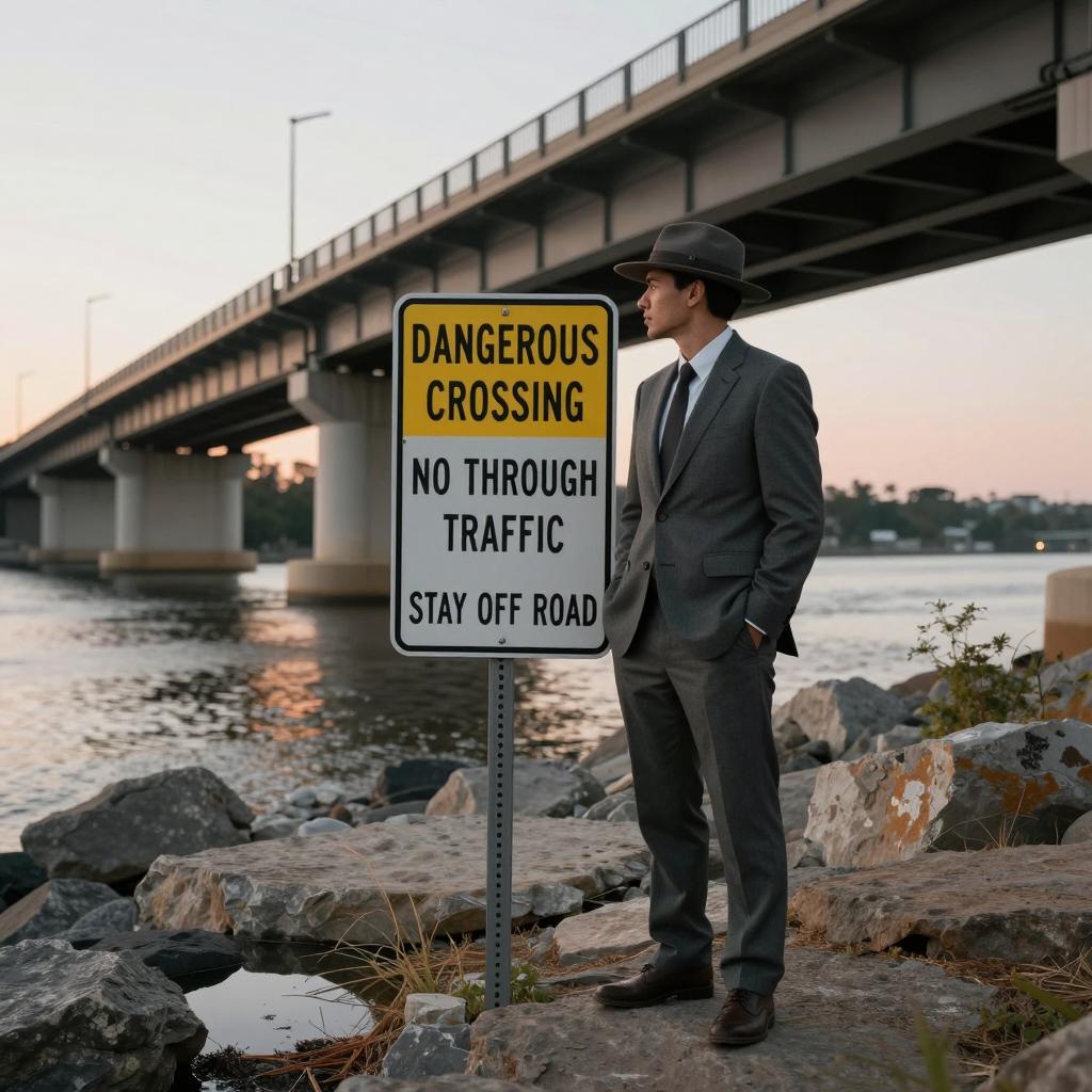 Man in grey suit and hat stands beside a sign on rocky ground under a bridge. Sign reads "Dangerous Crossing, No Through Traffic, Stay Off Road." Man faces left, hands in pockets. Bridge arches in background, sunset light. Water puddle in foreground. Rocks and sparse vegetation around.