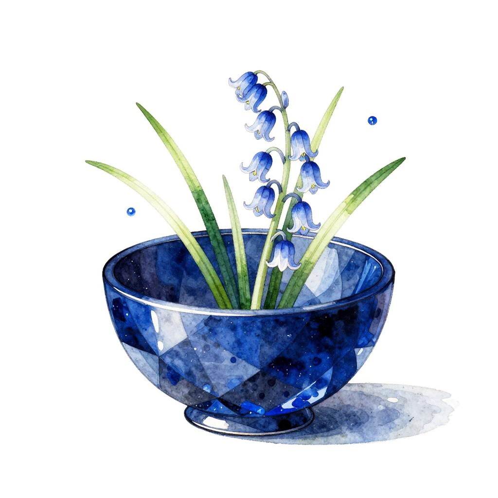 A contemporary still-life of a sleek midnight blue crystal bowl, filled with delicate bluebells, minimalist green stems, and tiny glittering sapphire dots. Executed in ink-and-watercolor with bold shapes, crisp edges, matte–gloss contrast, and careful negative space. Clean white gallery backdrop, vivid blues and greens, high contrast, subtle paper grain, refined lighting, serene mood, editorial quality.