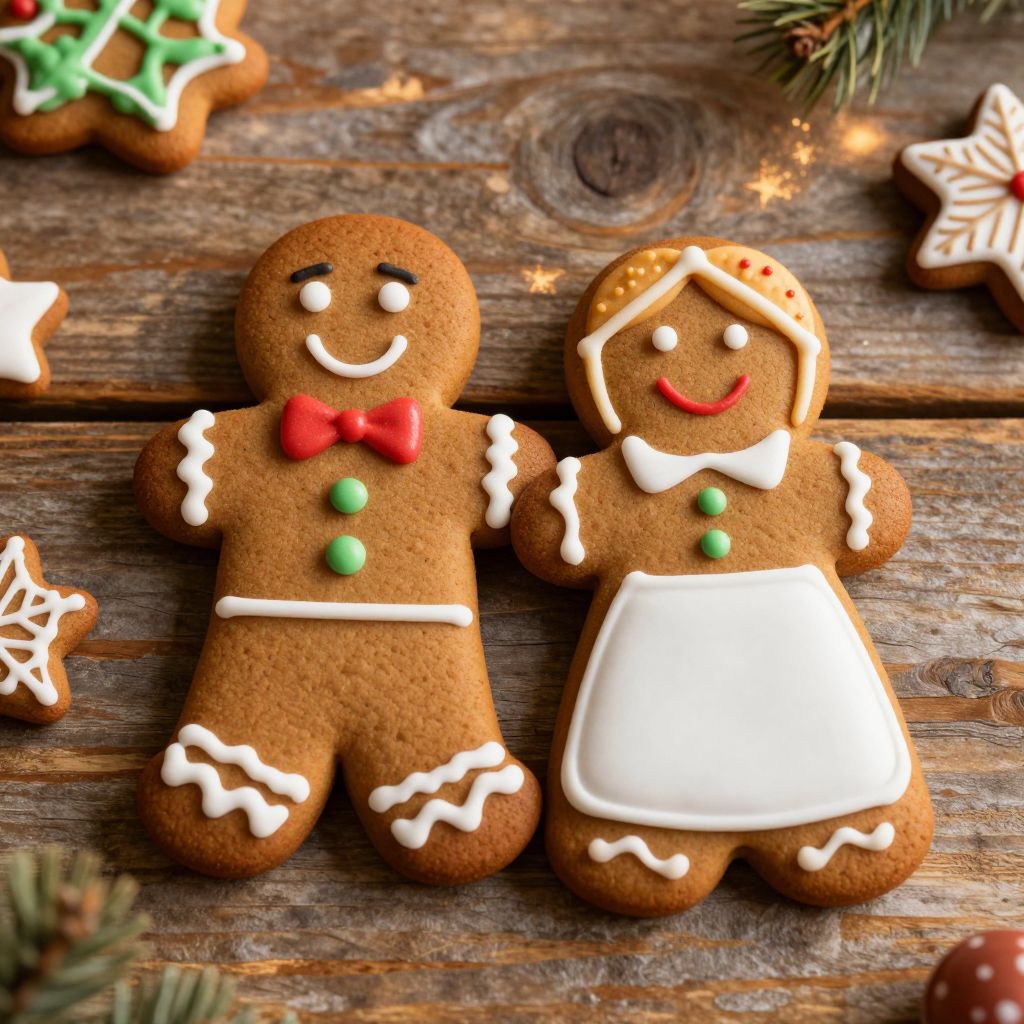 A charming holiday composition featuring gingerbread cookies shaped as a man and woman couple, adorned with festive icing details, set against a vintage wooden table backdrop illuminated by warm, golden-hour lighting, evoking a traditional homemade dessert aesthetic reminiscent of classic stock photography.