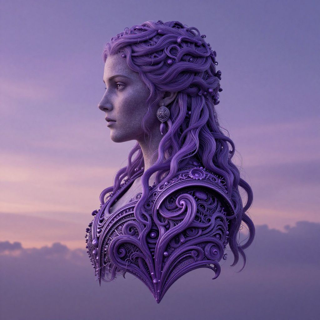 Hairy a sigil in the shape of a woman, in the style of game of thrones house sigil, purple colors, beautiful twilight colors, ornate, intricate, beautiful, organic, mycelium,