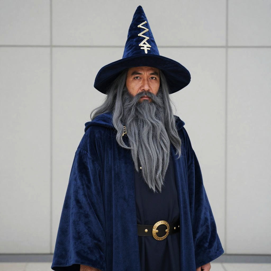 A man dressed in an elaborate wizard costume stands against a neutral tiled background, featuring a long gray beard and hair. He wears a deep blue velvet hat adorned with a decorative symbol and matching robe, embodying a photorealistic cosplay style often seen at fantasy festivals.