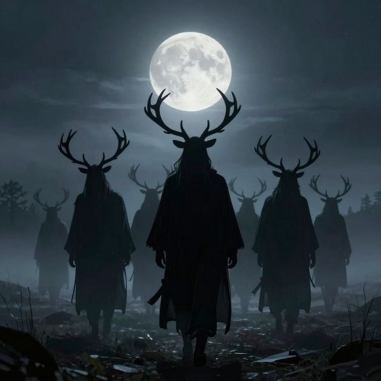A hauntingly atmospheric digital illustration depicts a procession of shadowy figures adorned with antlers, marching under the ethereal glow of a full moon, their silhouettes cast against a moody, misty landscape, evoking a sense of otherworldly mystery and dramatic tension.