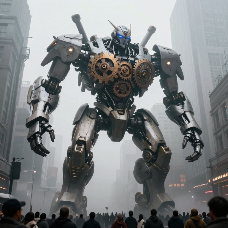 Digital artwork of a towering, silver mecha with blue eyes and large brass gears, standing in a foggy city street, surrounded by a crowd of