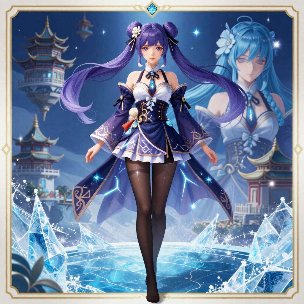 Digital anime-style illustration of a young woman with long, flowing purple hair in twin buns, adorned with white flowers. She has large, expressive purple eyes and is dressed in a dark blue, off-shoulder, ornate dress with white frills and black thigh-high stockings. She stands confidently on a glowing, ice-crystal platform, surrounded by illuminated, ornate pagodas in the night sky. A larger, translucent, blue-haired version of her is visible in the background. The image has a decorative, white-bordered frame with a small blue diamond at the top center. The overall color palette is cool, dominated by blues and purples.