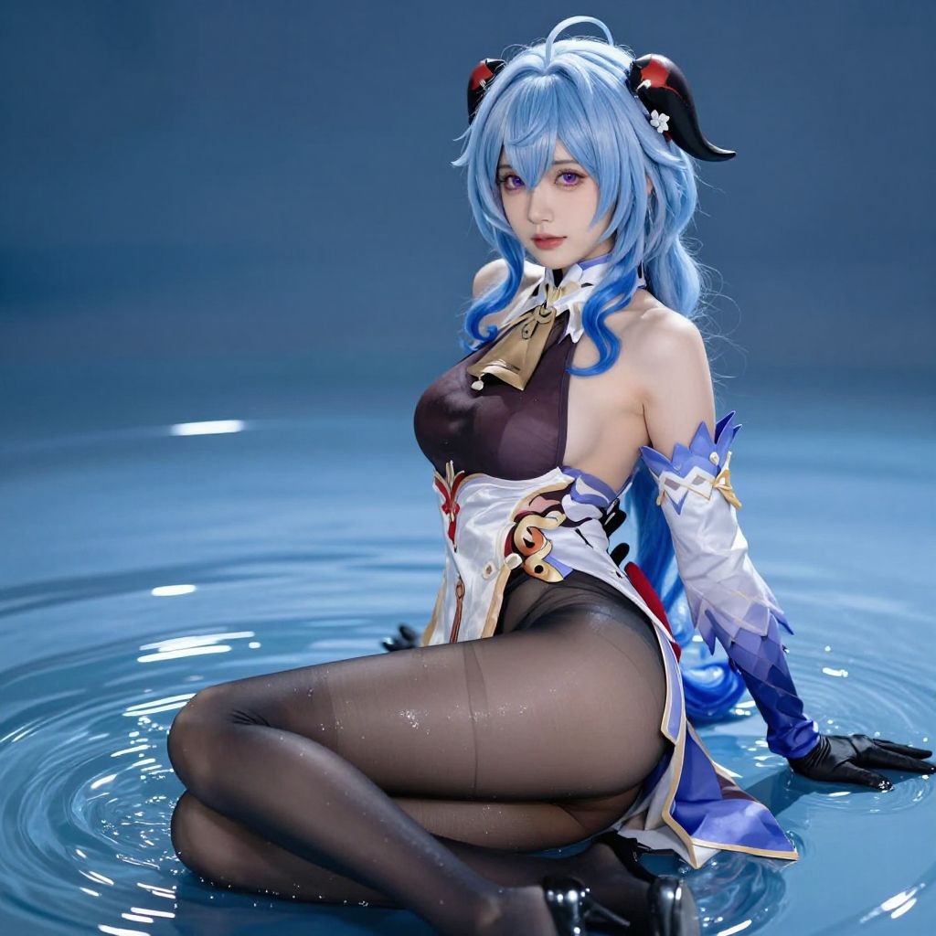 Masterpiece, best quality, 1girl, solo, long hair, breasts, looking at viewer, bangs, gloves, bare shoulders, medium breasts, sitting, blue hair, purple eyes, flower, ahoge, pantyhose, detached sleeves, horns, black gloves, water, high heels, from side, black pantyhose, sideboob, ganyu (genshin impact), Ganyu