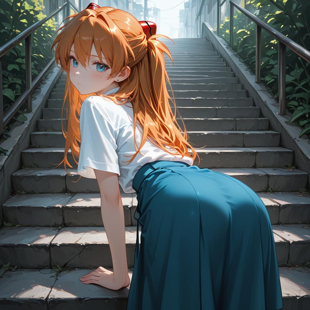1girl, solo, souryuu asuka langley, from behind, orange hair, long hair, tsurime, blue eyes, long eyelashes, thick eyelashes, looking at viewer, closed mouth, (white shirt:1.2), short sleeves, skirt, blue skirt, blue dress, outdoors, stairs, standing, ass