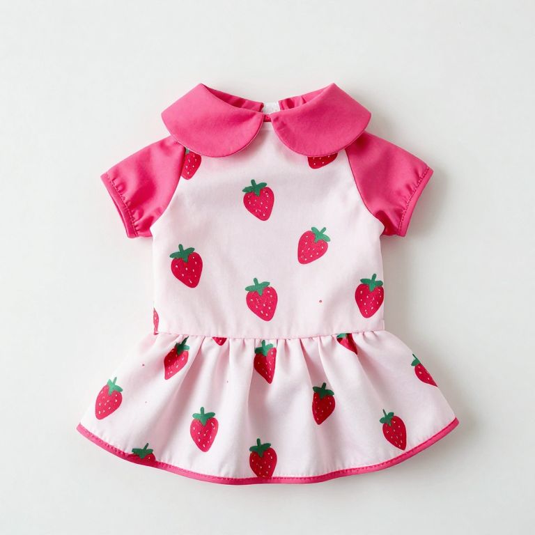 Cute strawberry-patterned one-piece puppy dog dress featuring a vibrant pink collar, sleeves, and pleated skirt, perfect for pet princess attire during parties and leisure activities.