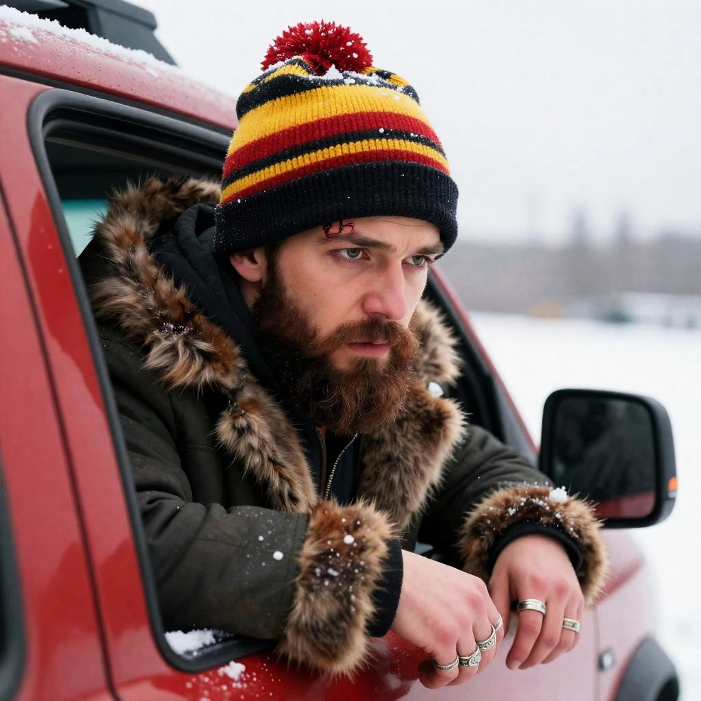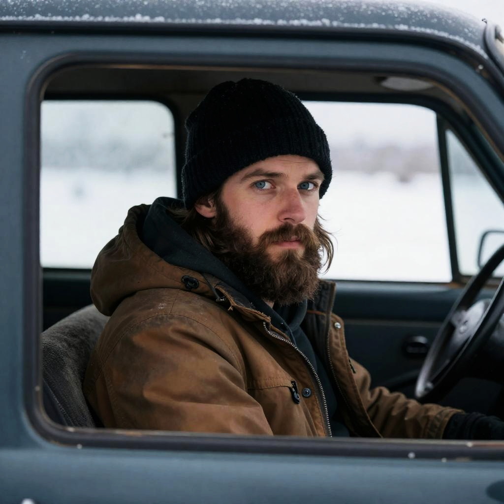 Photograph of a bearded man with long hair, wearing a black knitted hat and brown jacket, sitting in a worn, dark vehicle. His blue eyes are slightly intense. Frosty window in the background. Man looking forward. Rough, weathered ures on vehicle.