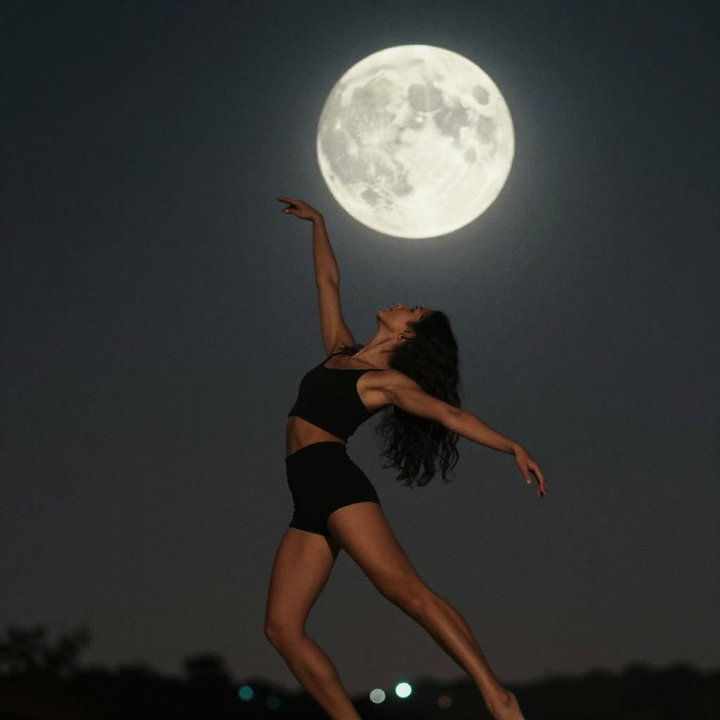 Cinematic photo 1girl, dancing in the sky, huge moon. 35mm photograph, film, bokeh, professional, 4k, highly detailed, neowrsk