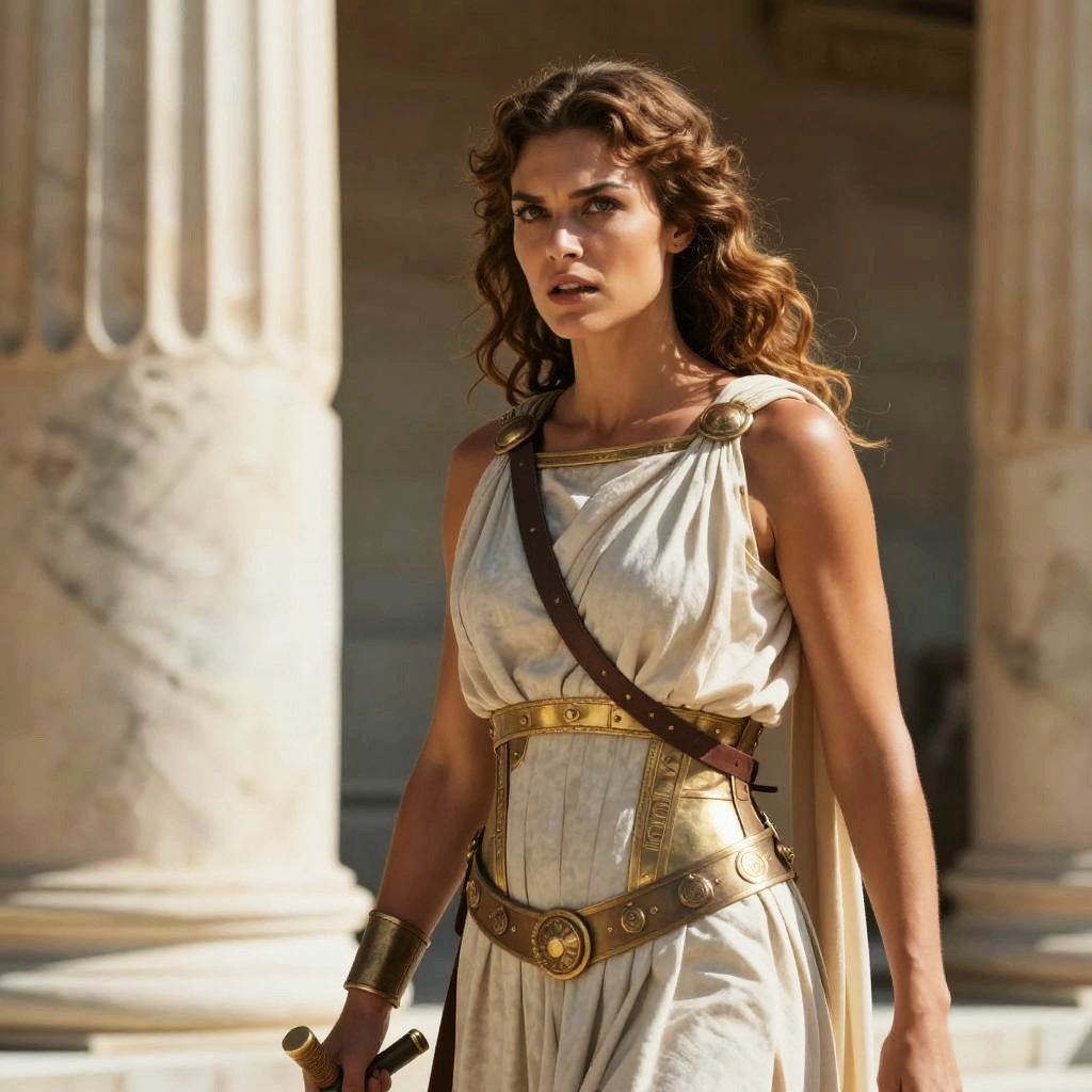 Photograph of a determined woman with wavy brown hair, wearing a white ancient Greek-style dress with gold accents, standing in a sunlit, marble