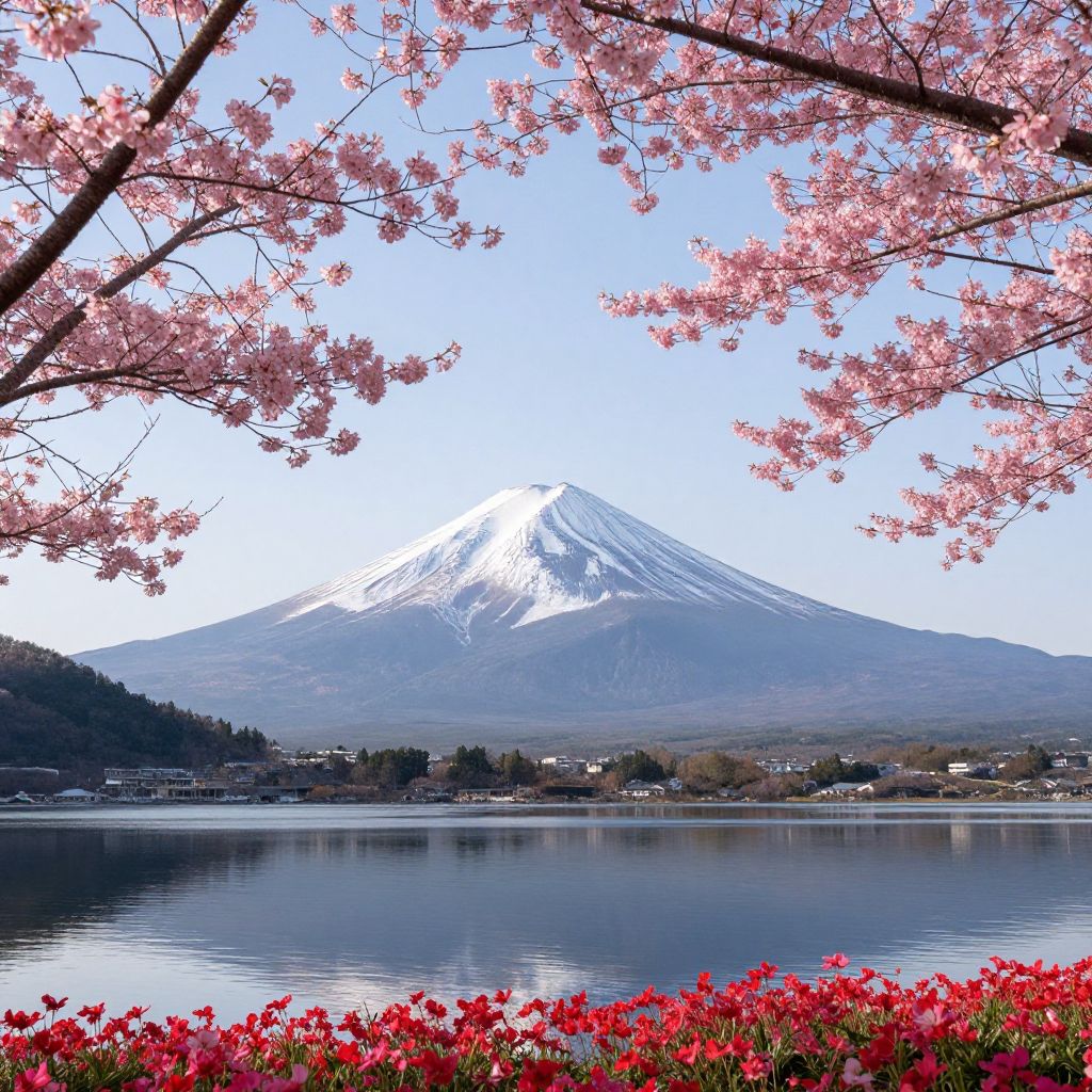 The image depicts a majestic mountain, likely Mt. Mayon, with its peak piercing through a scattered cloud formation. The mountain's dark, rugged surface contrasts sharply with the fluffy, white clouds that surround it. Below the mountain, a rural village is nestled among lush green rice fields, their vibrant hues of green and brown creating a serene landscape. The village consists of small, traditional Bahay Kubo structures, scattered across the fields, with some buildings closer to the foreground and others further back, giving depth to the scene. The fields are meticulously arranged in terraces, indicating careful agricultural practices. The overall composition is balanced, with the mountain as the central focal point, the village providing a sense of scale, and the rice fields extending the horizon, creating a harmonious and picturesque view.