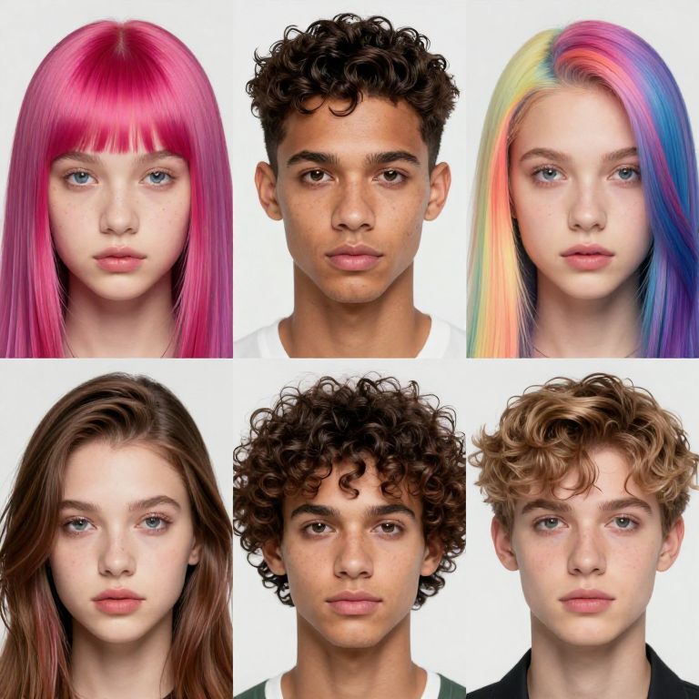 Photograph of six diverse young individuals with distinct hairstyles: pink, black curly, rainbow, brown, dark curly, and blonde, against a white background