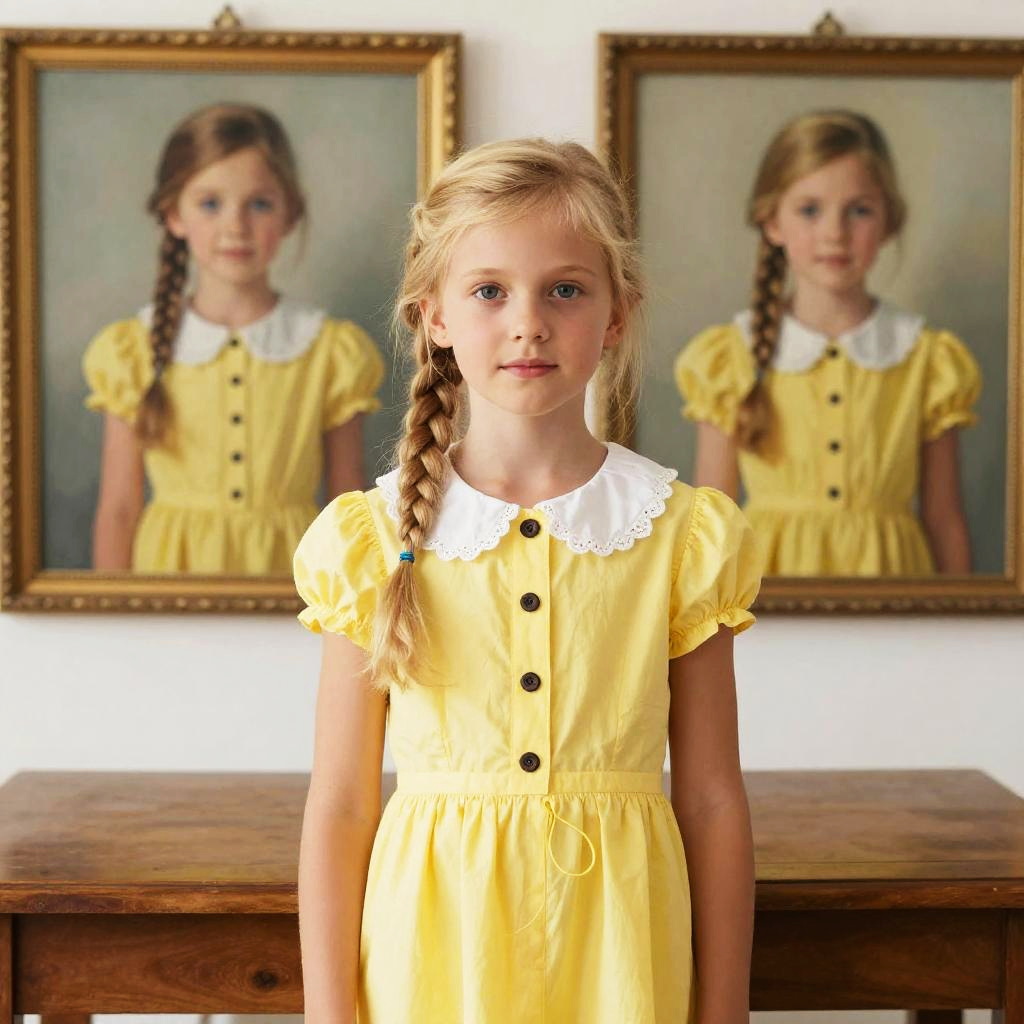 Photograph of a young blonde girl with braided hair, wearing a bright yellow dress with white lace collar and black buttons, standing indoors. In the background, there are two framed paintings of the same girl in similar yellow dresses. The paintings are slightly blurred, creating a depth-of-field effect. The room has a wooden table and a white wall.