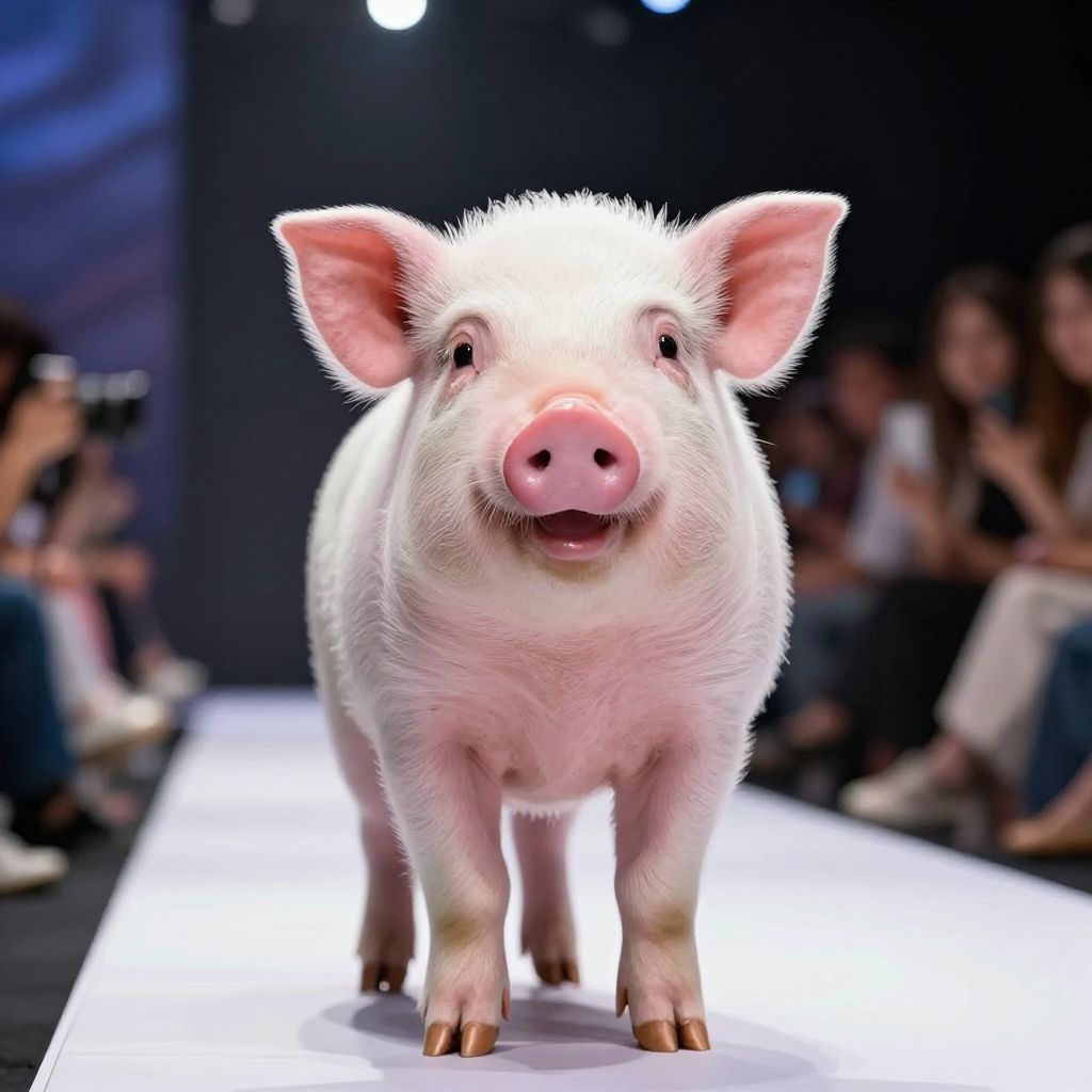 Photograph of a realistic, fluffy pink pig with large ears and a smiling expression, walking on a white runway under bright lights, with blurred audience members