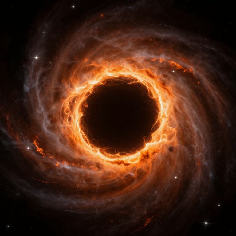 Radiant orange plasma forms a luminous ring around a dark, circular void, surrounded by swirling cosmic dust and stars, creating a mesmerizing celestial spectacle against the backdrop of deep space.