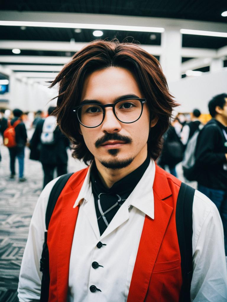Close-up portrait of a young man with bright red hair wearing an Anya Forger cosplay outfit at an anime convention. He wears a blue vest with gold buttons over a white shirt, a necklace, and has a friendly expression. The background shows other convention attendees in a crowded indoor setting.