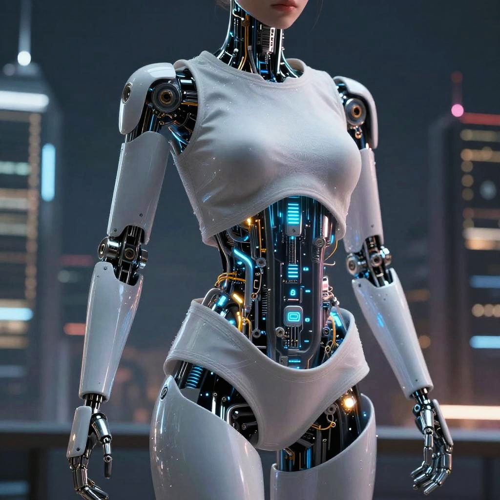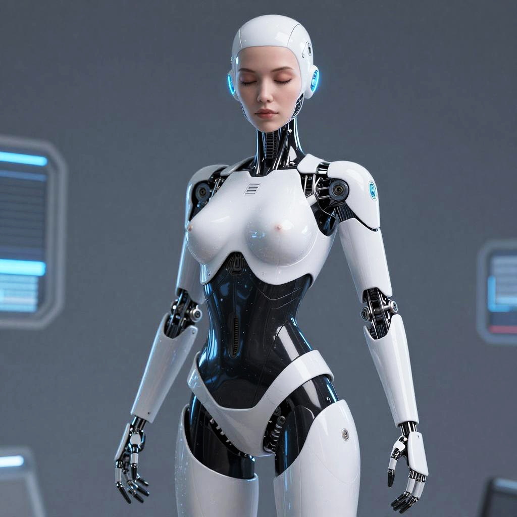 A CGI image of a sleek, futuristic female android with a white and black metallic body. She has a smooth, featureless head with blue glowing ear pieces, and her eyes are closed. Her physique is slender and curvy, with pronounced breasts. She stands confidently against a gray, tech-filled background with glowing blue and white panels. Her fingers and joints are articulated, adding a lifelike touch.