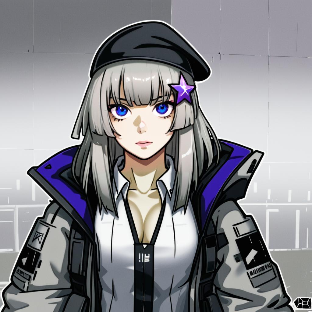 Aa-12 (girls' frontline), girls' frontline, 1girl, blue eyes, bags under eyes, long hair, grey hair, star hair ornament, ahoge, medium breasts, cleavage, black headwear, by artist kurogarasu, anime