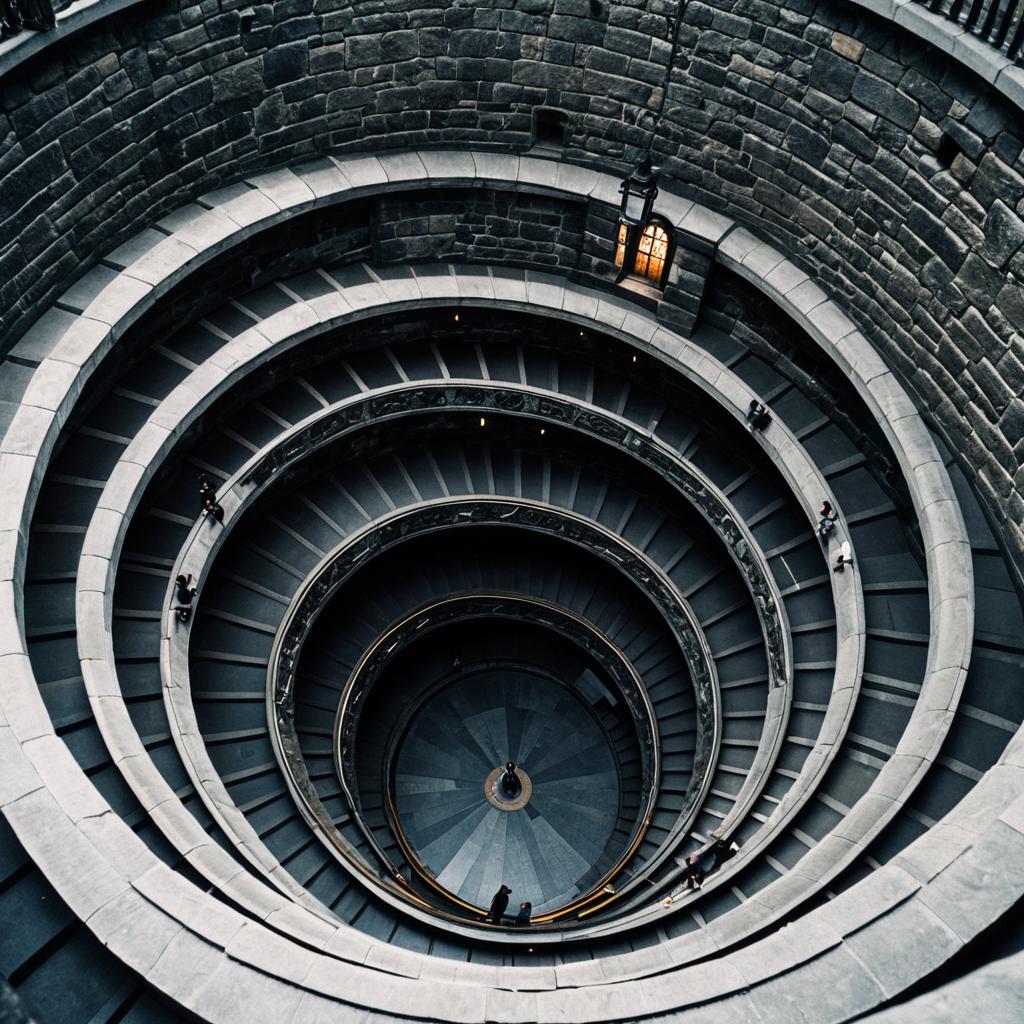 Top-down view of a large, circular stone spiral staircase within a tower. The stone walls feature heavy wooden doors at intervals, and the staircase descends clockwise to a central wooden door on the lower floor. Several people are walking along the steps. The staircase and architecture suggest an ancient or medieval structure.