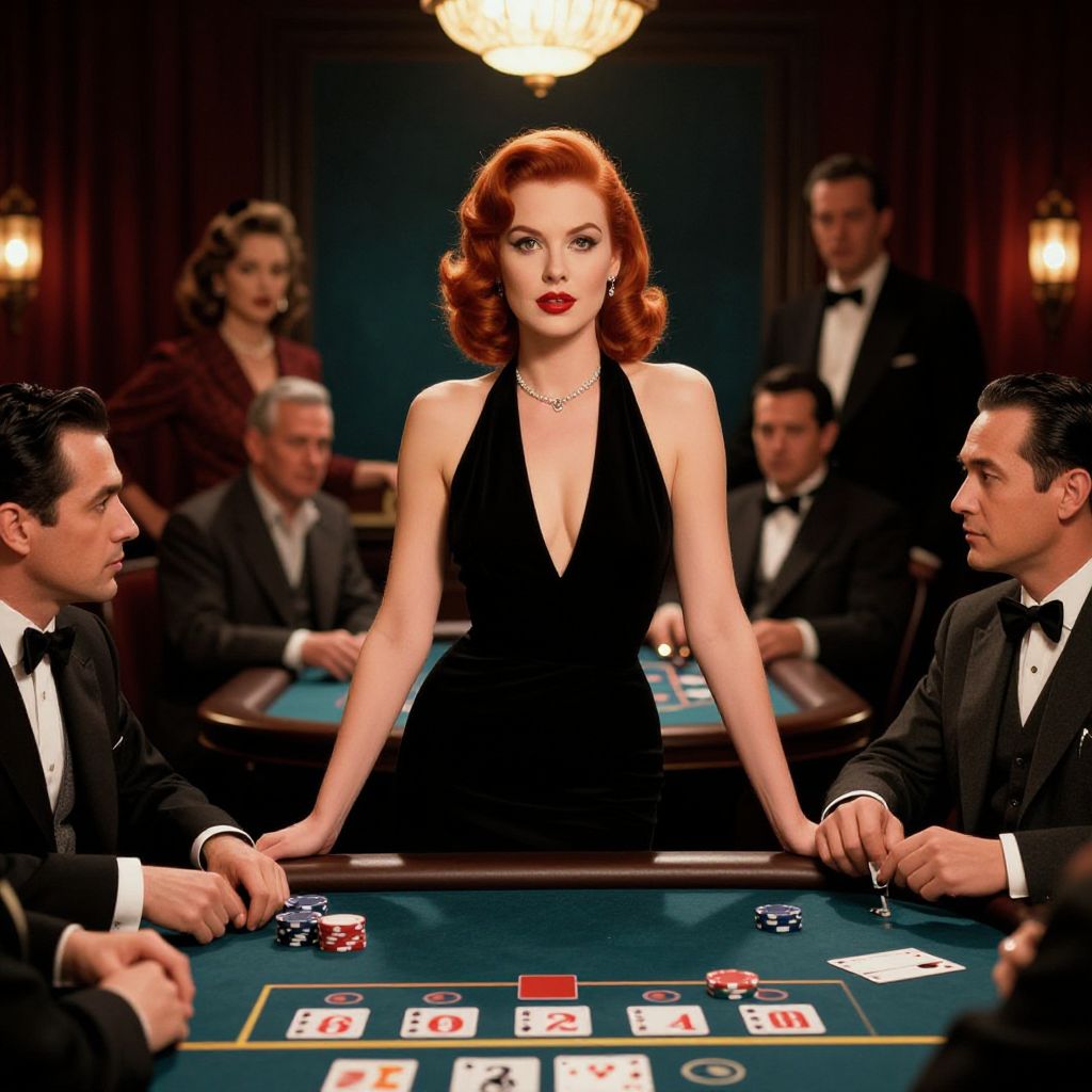 A glamorous woman with styled red hair and a deep-plunging black dress stands confidently at a casino table surrounded by well-dressed men in a vintage, 1940s-inspired setting. The scene exudes a classic film noir atmosphere with dramatic lighting and elegant attire, emphasizing the luxurious and suspenseful mood of a high-stakes gambling environment.