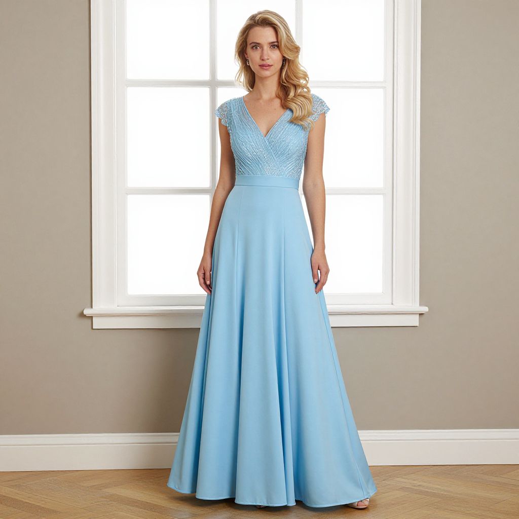 Photograph of a blonde woman standing in a minimalistic room with light gray walls and a large, sunlit window in the background. She wears a light blue, floor-length, V-neck gown with lace detailing on the bodice and short, cap sleeves. The gown's skirt is full and flows gracefully to the floor. The woman has wavy hair, styled to one side, and she stands with a relaxed posture, looking directly at the camera. The floor is wooden with a herringbone pattern, and the window is framed in white. The overall style is elegant and sophisticated.