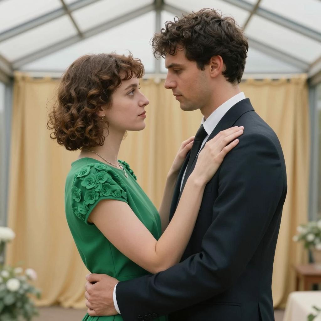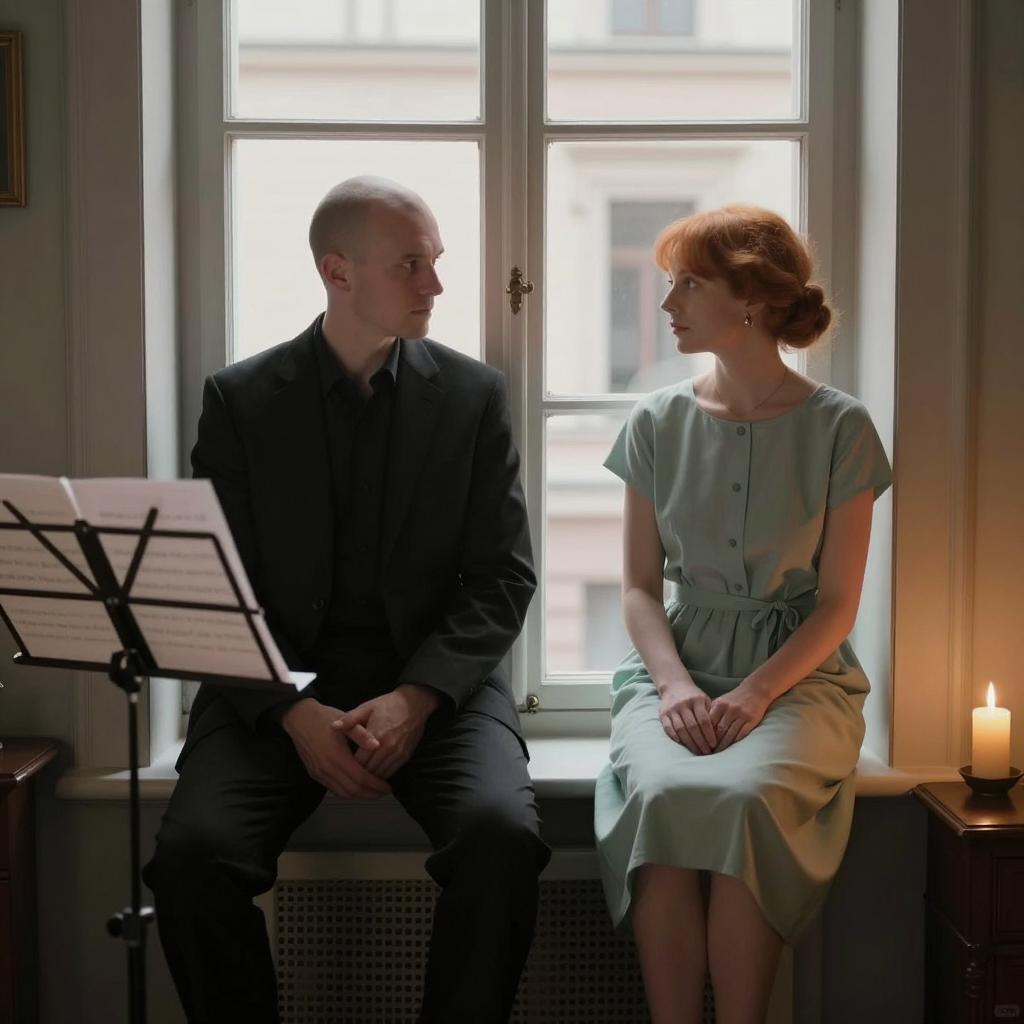 Man and woman sit on a windowsill, facing each other. Man in black suit, bald, serious expression. Woman in light green dress, red hair in bun, calm expression. Music stand with sheet music on left, candle on right. Large window behind them. Dimly lit room.